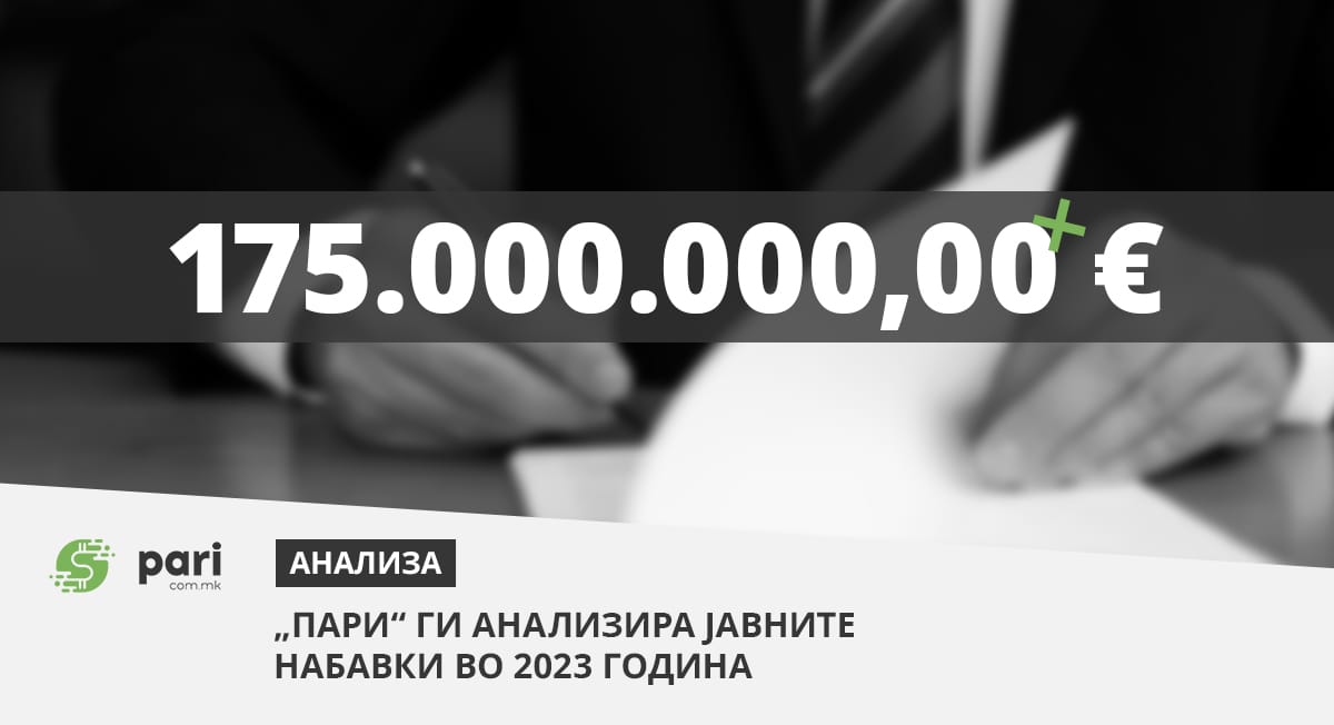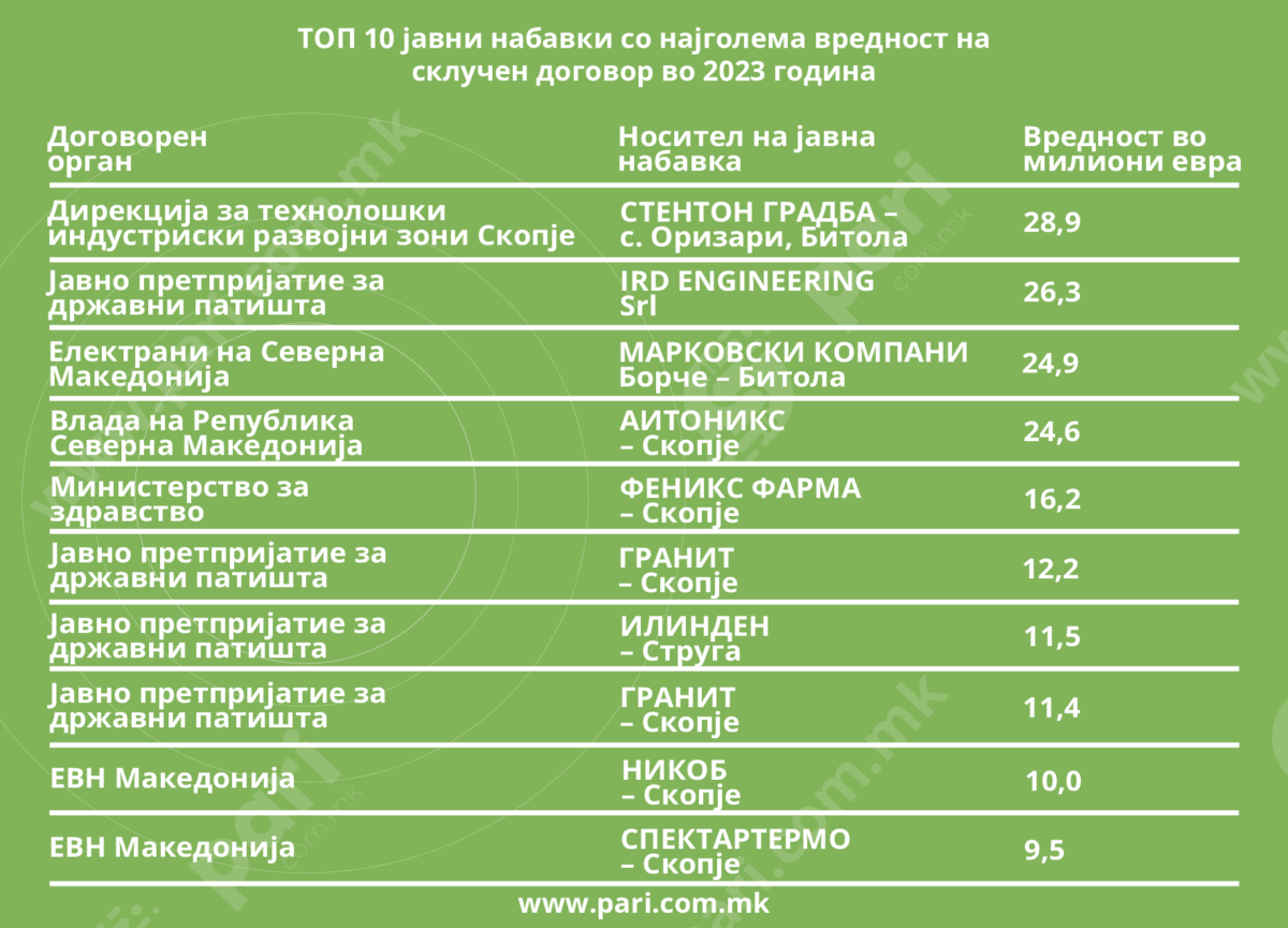Порталот Пари, во соработка со платформата БизнисМрежа.мк, направи анализа на десетте јавни набавки со најголема вредност на договор склучен во 2023 година. Нивниот збир покажа договорена вредност од над 175 милиони евра, што во споредба со минатогодишната расходна страна на планираниот државен буџет е околу 3,3 насто.
