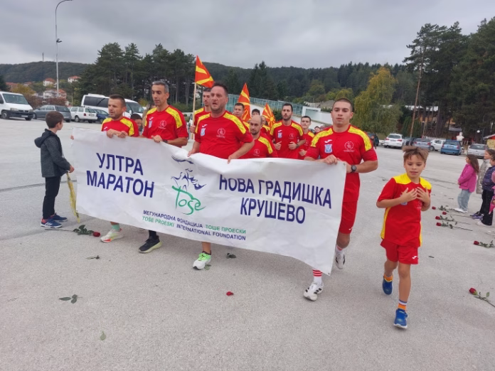 Со 500 рози, тага и сеќавања, крушевчани денеска ги пречекаа 12-те ултрамаратонци кои пристигнаа во Крушево – на Гумење, кај вечното почивалиште на Тоше Проески, македонската и балканска музичка легенда, големиот човек и хуманитарец.