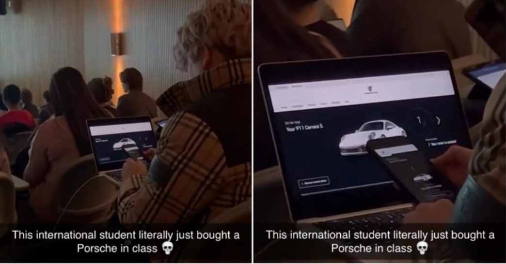 Видеото покажува студент кој изгледа како да купува ново Порше за време на предавање. „Меѓународен студент штотуку купи Порше за време на предавање“, гласи описот на видеото кое брзо стана вирално, а исто така наиде на бројни коментари.