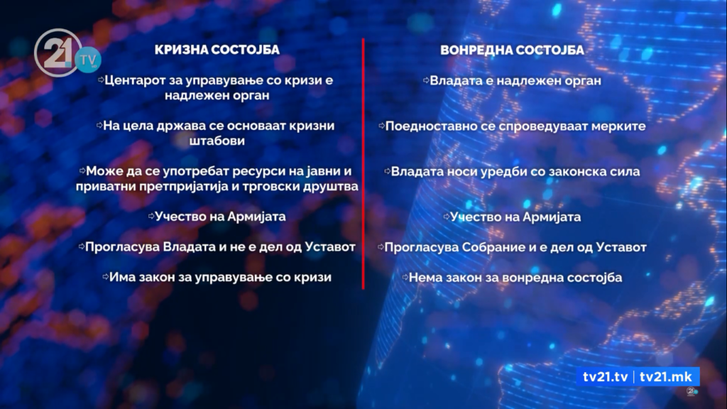 Мерките се речиси исти, но една прави клучна разлика. А тоа е прогласувањето. Кризна состојба се прогласува лесно преку Влада, а за вонредна потребно е 2/3 мнозинство во Собранието, кое во овие моменти е тешко да се собере. Доколку пак Собранието е распуштено или нефункционално, тогаш вонредна состојба може да прогласи и претседателот на државата, што беше случај на почетокот од годинава.Најверојатно утре Владата ќе излезе со предлог понуда до приватните болници , како истите и под кои услови би биле дел од здрваствениот систем во земјава , а во функција на справување со Ковид 19 .
