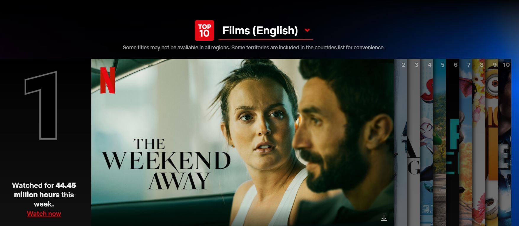 Филмот The Weekend Away е рангиран број 1 на глобалната листа на најгледани филмови на Нетфликс. Собра повеќе од 44 милиони часови гледаност во последната недела.