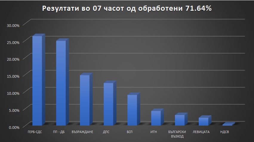 Според податоците до 7 часот, ова се резултатите од изборите во Бугарија, а прв на листата е Бојко Борисов односно ГЕРБ-СДС со 25,6%, а следуваат Продолжуваме со промените и Кирил Петков со 25,3%.