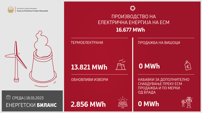 АД ЕСМ на 18.01.2023 година произведe 16.677 MWh електрична енергија, со што целосно со сопствена произведена енергија ги задоволи потребите на домаќинствата и малите потрошувачи, како и потребите за дополнителни снабдувања за училишта, прехранбена индустрија и други витални државни субјекти.