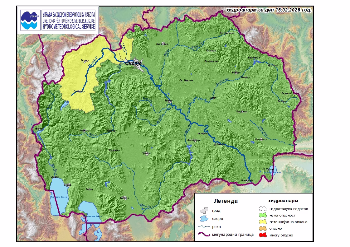 Управата за хидрометеоролошки работи (УХМР) издаде итно хидролошко предупредување за вечерните часови и претстојниот ден (15.02.2026), најавувајќи обилни врнежи кои можат да предизвикаат нагло зголемување на нивото на реките.