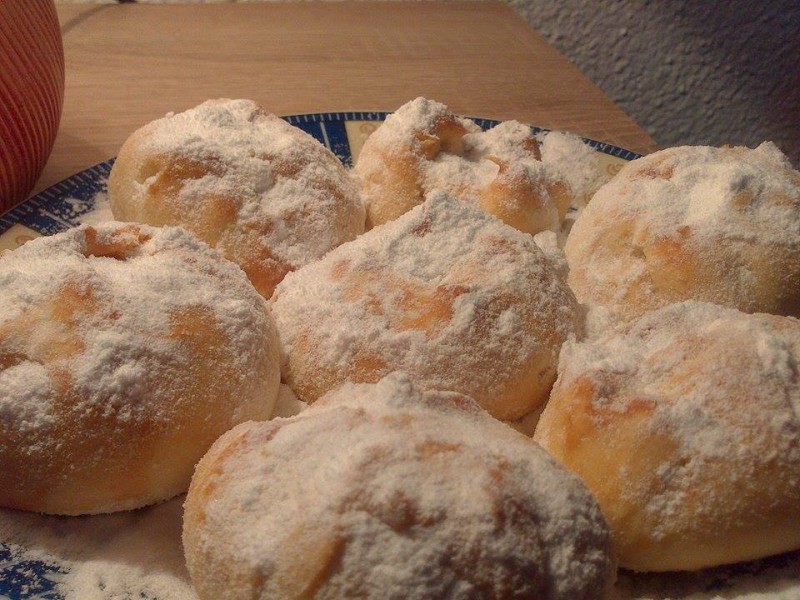 Потоа ги додаваме квасецот и пецивото. Промешуваме со лажица и го додаваме брашното. Замесуваме тесто со средна мекост, од кое што правиме топчиња. Топчињата ги плескаме со рака и правиме мало дупче во кое што ставаме малку фил. Ги виткаме навнатре. Кога ќе ја завршиме подготовката, колачињата ги ставаме да се печат околу 15 мин. на 180 степени. Кога ќе се испечат и малку ќе одморат ги посипуваме со шеќер во прав.
