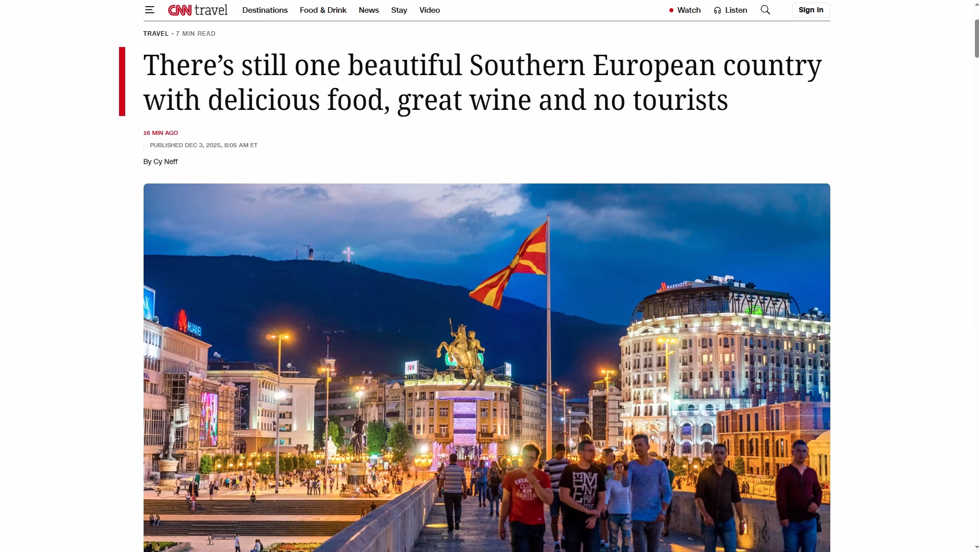 „Една од последните шанси во Јужна Европа да се истражи патот помалку патуван.“ Вака престижниот американски медиум CNN ја опишува Северна Македонија во својата најнова опширна репортажа. Од електрично зелените падини до снежните врвови, земјата е претставена како неистражен џеб на Балканот каде слоевитата историја – од византиската и отоманската до југословенската ера – се спојува со сеприсутните планини за да создаде култура на длабока традиција и искрено гостопримство.