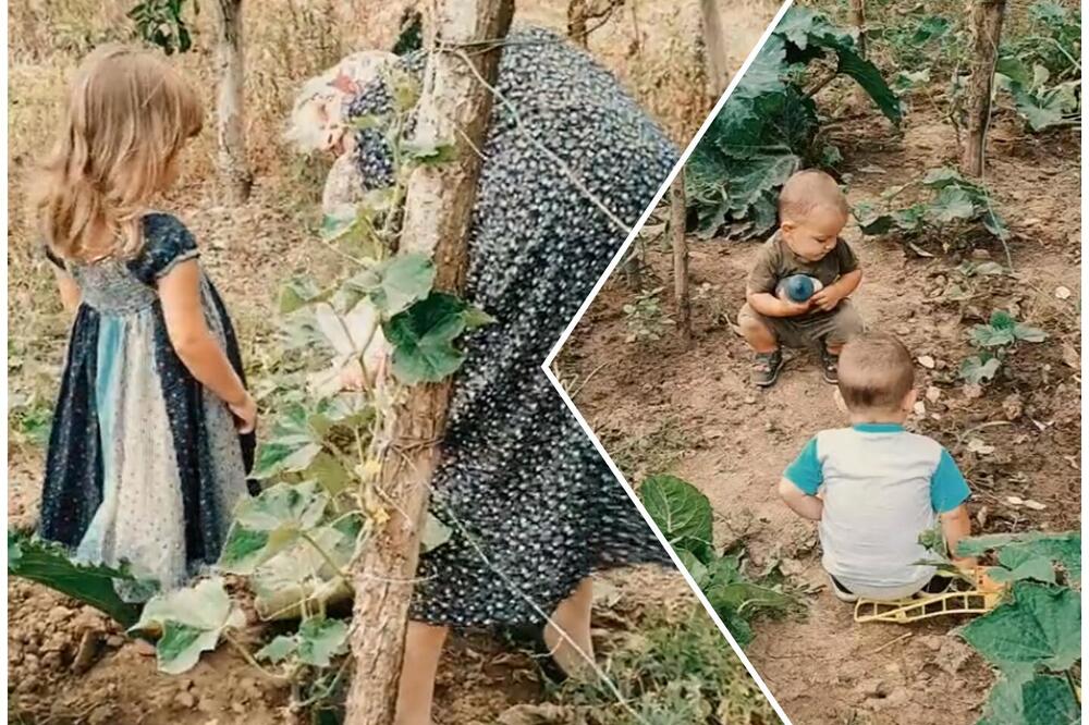 На видеото кое го објави, може да се види една баба опкружена со нејзините правнуци кои работат во градината додека и помагаат.