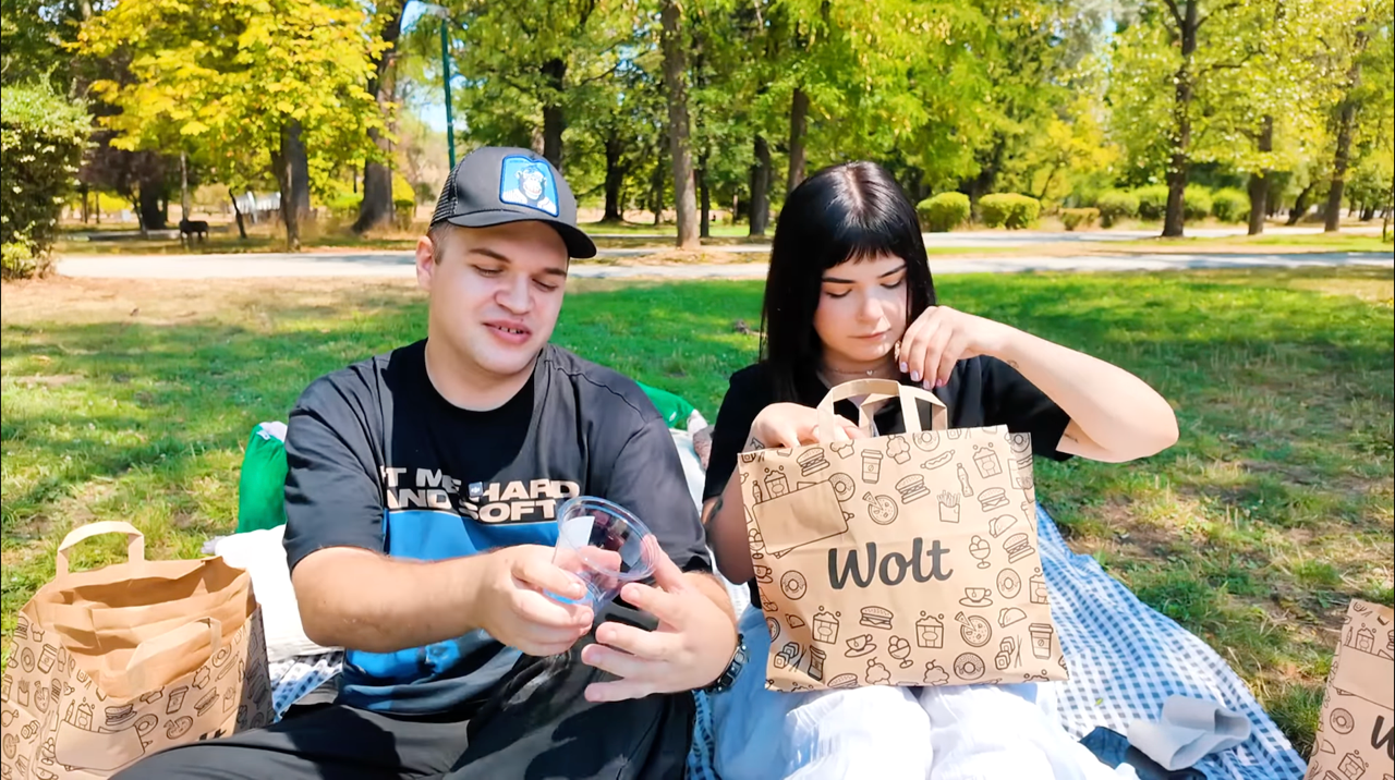 „Зошто да се мачиме дома да правиме појадок, кога можеме да седнеме во парк и да си нарачаме од Wolt. Мојата храна ја нарача Александра и немам претстава што нарачала. Ќе пробувам со превез на очи. И јас за неа исто – нарачав појадок што ќе го пробува со превез на очи“, објаснува на почетокот на видеото Стефан.