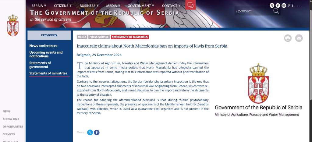 Министерството за земјоделство, шумарство и водостопанство (МЗШВ) на Србија денеска експресно ги демантираше македонските власти кои тврдеа дека Македонија вовела забрана за увоз на киви од Србија. Од Министерството се категорични: информацијата е пласирана без проверка на фактите и е целосно неточна.