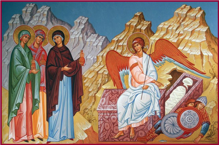 Овие жени кога купија миро, дојдоа многу рано да го оплакаат и да го помазаат Христа, но во гробот видоа два Ангели, со блескав изглед, како седат еден спроти друг. Потоа и Христа го видоа и му се поклонија.