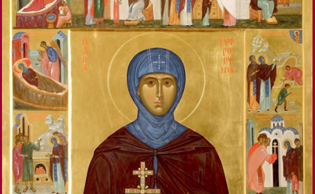 Ќерка на полоцкиот кнез Всеслав. Кога родителите сакаа да ја свршат, побегна во еден женски манастир и се замонаши. Трипати ѝ се јави Ангел Господов и ѝ го покажуваше местото каде што ѝ претстоеше да устрои нов манастир од девици. Кон монаштво ја привлече и својата сестра Евдокија и многу други девојки од благороднички род.