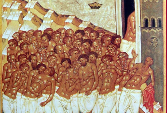 Мачителите, лути како ѕверови, ги врзаа светиите и ги фрлија во тамошното езеро и поставија наоколу стражари за ниеден да не излезе од водата. Имаше силен мраз, езерото мрзнеше околу телата на мачениците. За да бидат маките посилни, мачителите загрејаа и осветлија бања покрај езерото близу до страдалците, за тие гледајќи ја некако да се подлажат и да се одречат од Христа и да ги признаат римските идоли. И навистина, еден се опрелести, излезе од водата и влезе во топлата бања.