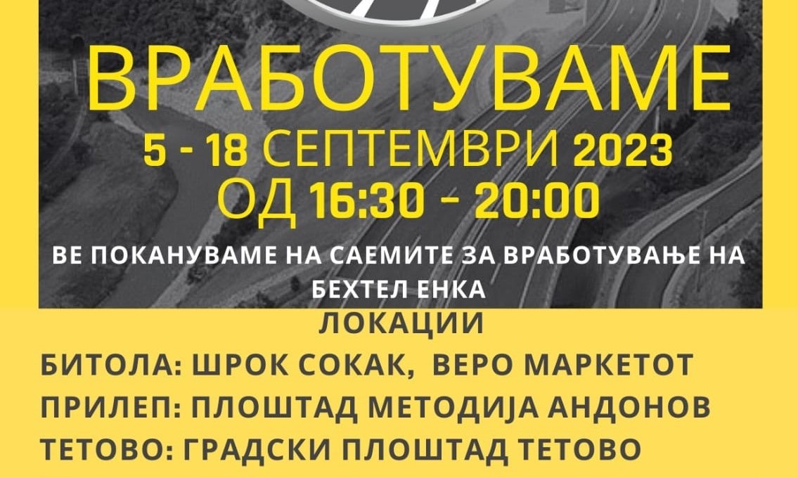 „Во периодот од 16.30 до 20.00 часот секој ден, сите заинтересирани за работа во „Бехтел и Енка’ ќе можат да се запознаат со широките можности за вработување коишто ги нуди конзорциумот за време на изградбата на коридорските автопатски делници во нашата земја во следните речиси пет години. Саемот ќе се одржува на плоштадите и секој оној кој сака да биде дел од оваа приказна може да види дали има работа согласно со неговите професионални вештини., велат од Државни патишта.
