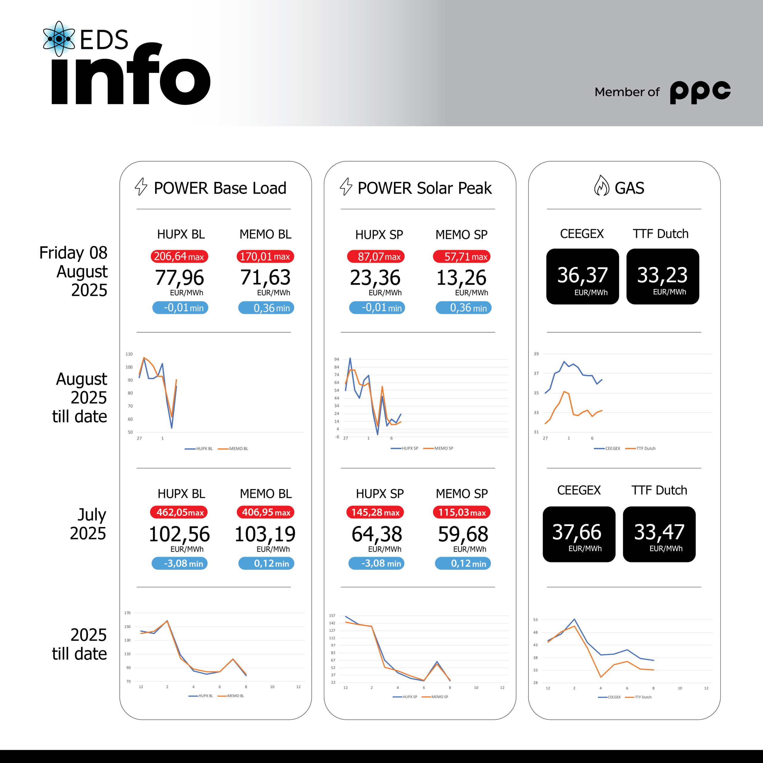 Согласно податоците за движењето на цените на берзата HUPX во Унгарија за 08 август просечната часовна цена на еден мегават час електрична енергија (baseload) изнесува 77,96 евра/mwh, додека на Македонската берза за електрична енергија цената е 71,63 евра/mwh