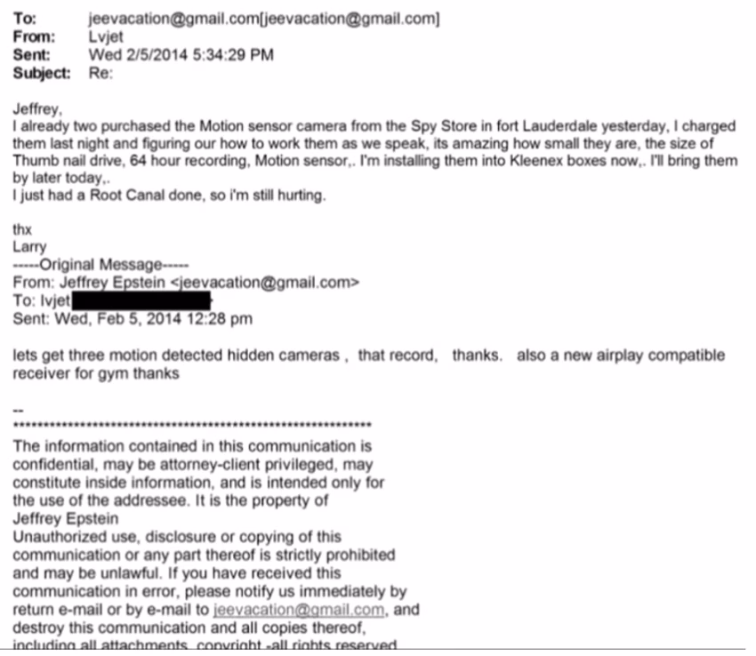 „Ајде да земеме три скриени камери со детекција на движење, кои снимаат, благодарам“, напишал Џефри Епштајн во е-пошта од 5 февруари 2014 година.