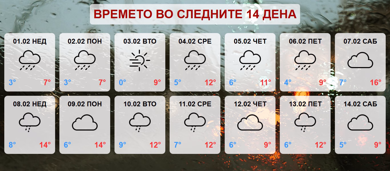 Генерално, наредните 14 дена ќе минат во знакот на благи температури за февруари, без најави за поизразен студ или снег, но со чести врнежи и променливо време, што бара зголемено внимание во сообраќајот и при секојдневните активности.