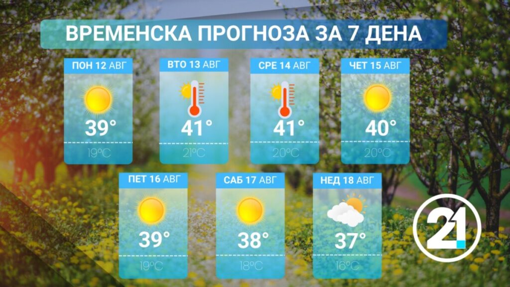 Температурите во Македонија во следните седум дена ќе бидат екстремно високиу. Особено топло и критично ќе биде во вторник и во среда, каде што температурите ќе одат и до 41 степен.