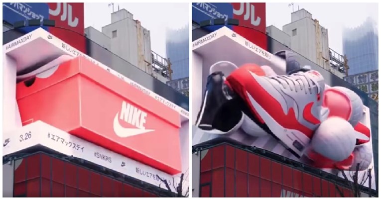 Имено, во зградата Nike во Токио направија огромен постер со 3D приказ на портокаловата кутија на Nike патики која се отвора и потоа гледаме различни модели на патики.