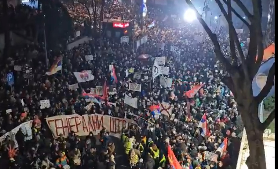 Сообраќајот на улицата Таковска каде што се наоѓа главната зграда на РТС е во прекин. Претходно полицијата го запре сообраќајот на излезот од тунелот Теразие за да на протестот да дојдат дел од студенти, средношколци и граѓани од правец на Нов Белград.