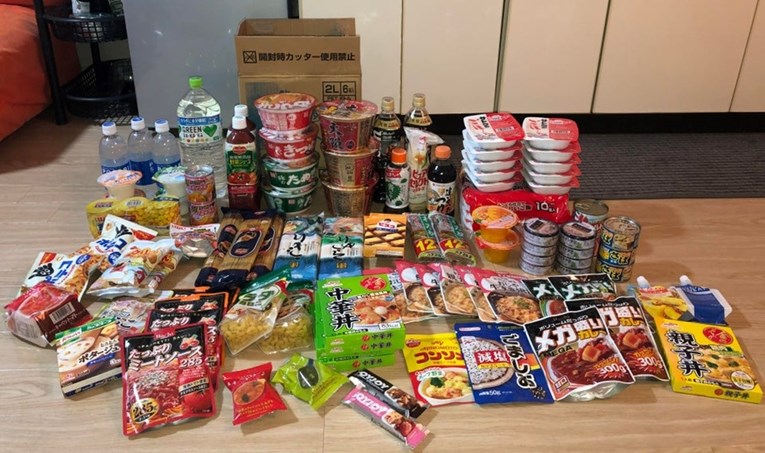 „Јапонската влада испраќа бесплатен пакет за луѓето кои се во карантин дома! Изложената храна е за едно лице (јас) во Токио“, стои на фотографијата на која се гледа содржината на пакетот.