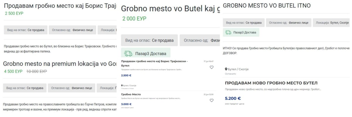 „Продавам гробно место во Бутел, во близина на Борис Трајковски. Гробното место е добро сочувано и се наоѓа веднаш до асфалтирана патека. Цена 2.500 евра“, „Се продава гробно место во Бутел со документи. Цена по договор“,
