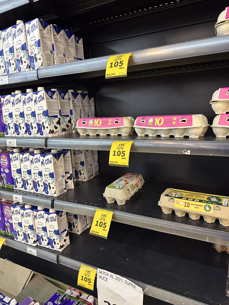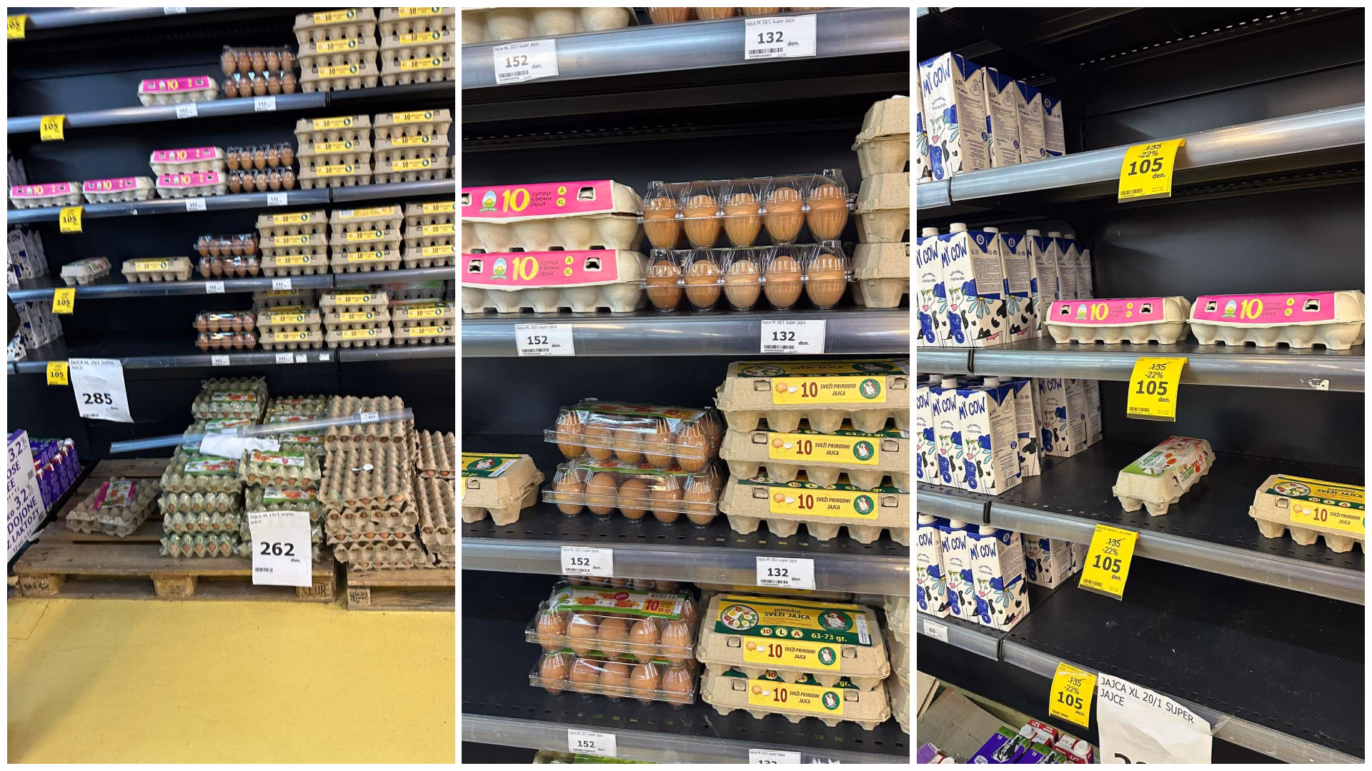 Високите редовни цени ги принудуваат купувачите да ги „ловат“ производите што се на акција. На втората фотографија се забележува дека пакувањата со јајца кои се намалени на 105 денари (со попуст од 22%) се значително потрошени и рафтовите се полупразни.