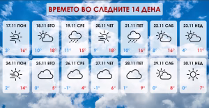 Во следните две недели регионот очекува променливо време со чести промени на температурите и условите, покажува 14-дневната прогноза. Периодот што следи носи комбинација од сончеви денови, облачност и повремени врнежи од дожд. Според податоците, во првата половина од прогнозата дневните температури ќе се движат меѓу 15 и 18 степени, со најтопли денови на 18 и … Продолжи со читање Какво ќе биде времето до крајот на ноември?