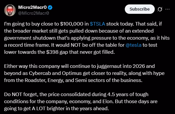 „Она што Маск го гради е екосистем за иднината – од вештачка интелигенција до роботика и одржлива енергија. Затоа велам секој краткорочен пад на цената, предизвикан од пазарна паника, не е ризик, туку најдобрата шанса за купување пред вистинскиот раст“, додава тој.