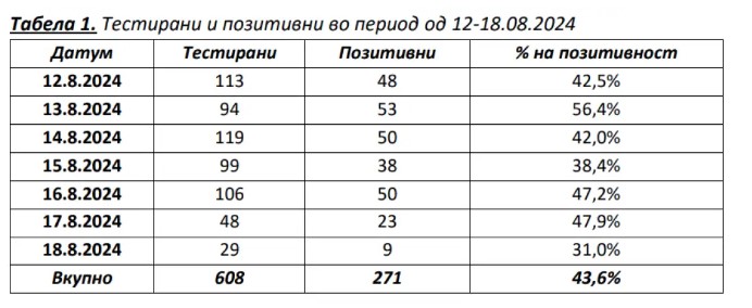 Од 12 до 18 август во државава регистриран е 271 нов случај на болни од Ковид-19 што претставува зголемување од 60,4 проценти во однос на претходната недела. Тестирани се вкупно 608 материјали во лабораториите каде се спроведува молекуларно тестирање и антигенско тестирање за присуство на SARS-CoV-2, со зголемување од 33,3 проценти.