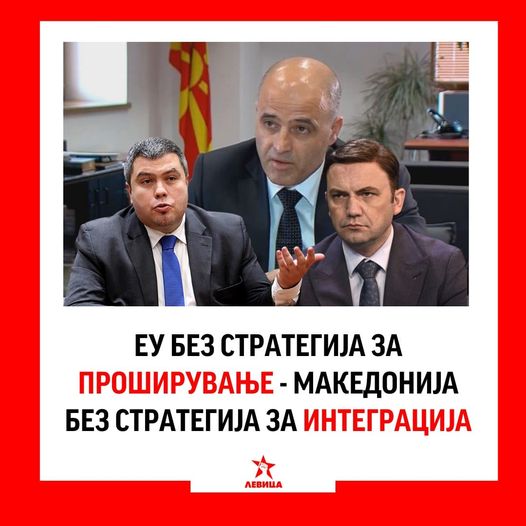 Стратегијата на актуелната криминална влада, во отсуство на реални реформи и пропаст на клучните сфери – образование, здравство, економија, доуништување на фосилите од груевистичкиот судски систем и целосна институционална нефункционалност – е сведена на исполнување на регресивните великодржавни идеи на политичките фактори во земјава и соседството.