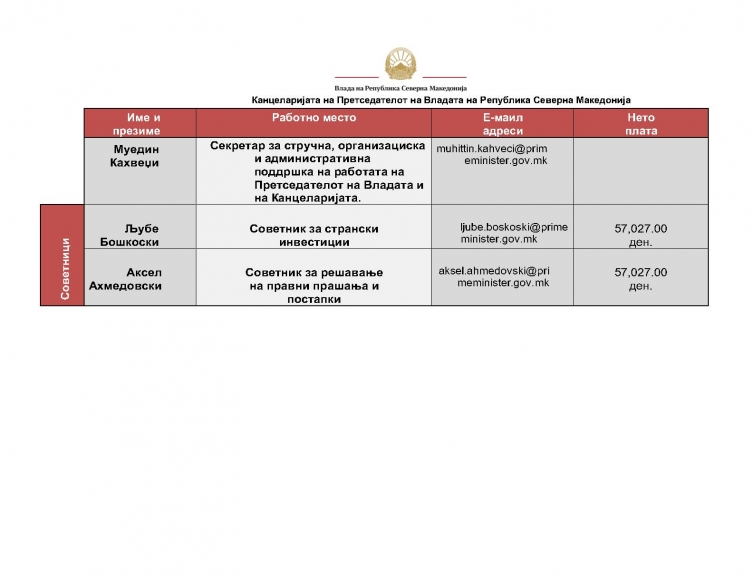 Најпосле, Владата ги објави платите и имињата на соработниците и советниците вработени во трите владини потсекретаријати. Од народни пари, за потребите на Ковачевски, ангажирани се 15 надворешни соработници и уште околу 25 соработници и советници кои влегуваат во списоците во трите потсекретаријати, се вели во соопштението на Левица.
