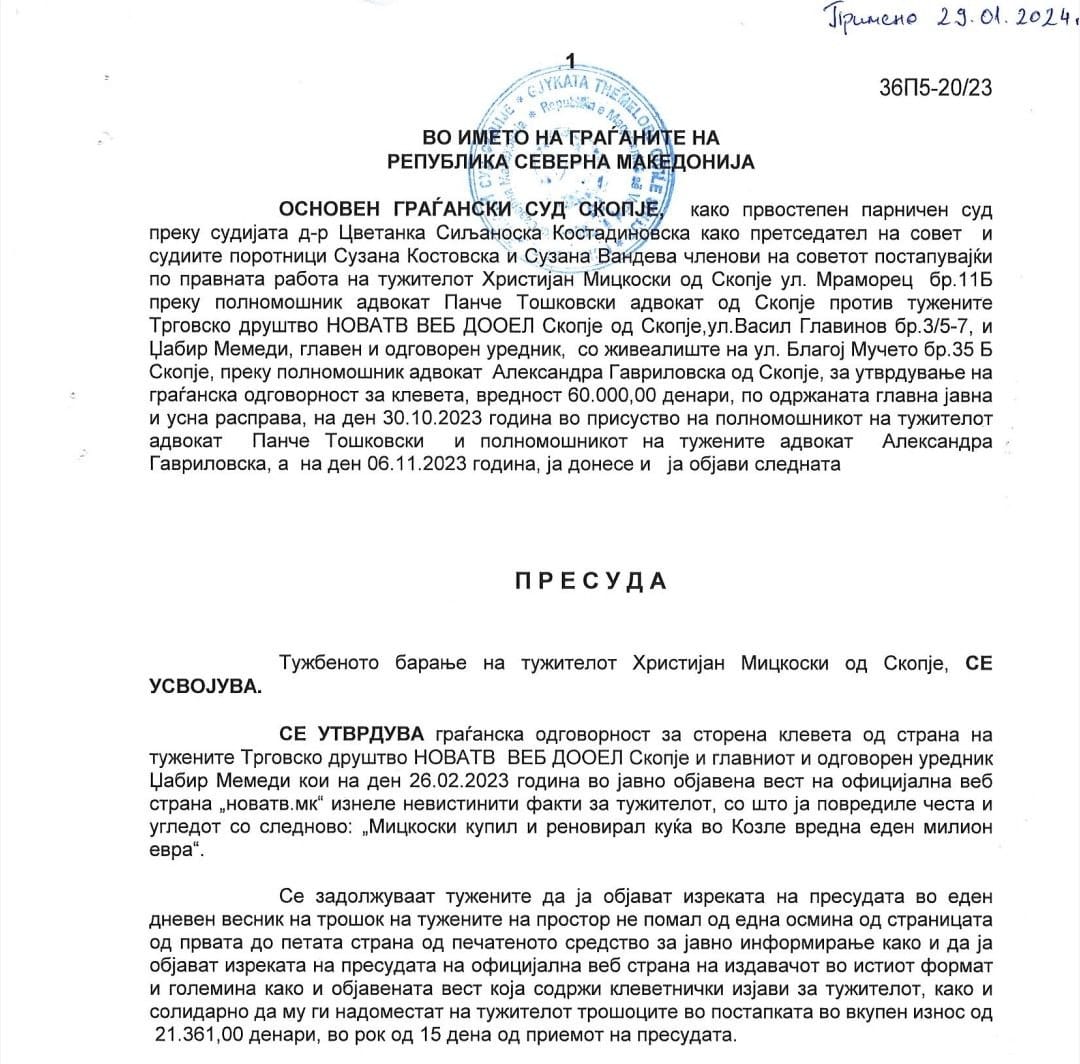 Претседателот на ВМРО-ДПМНЕ утрово на друштвените мрежи објави статус со приложена фотографија од пресуда во која пишува дека веб порталот Нова и Џабир Дерала се осудени дека изнеле невистинити факти за Христијан Мицкоски.