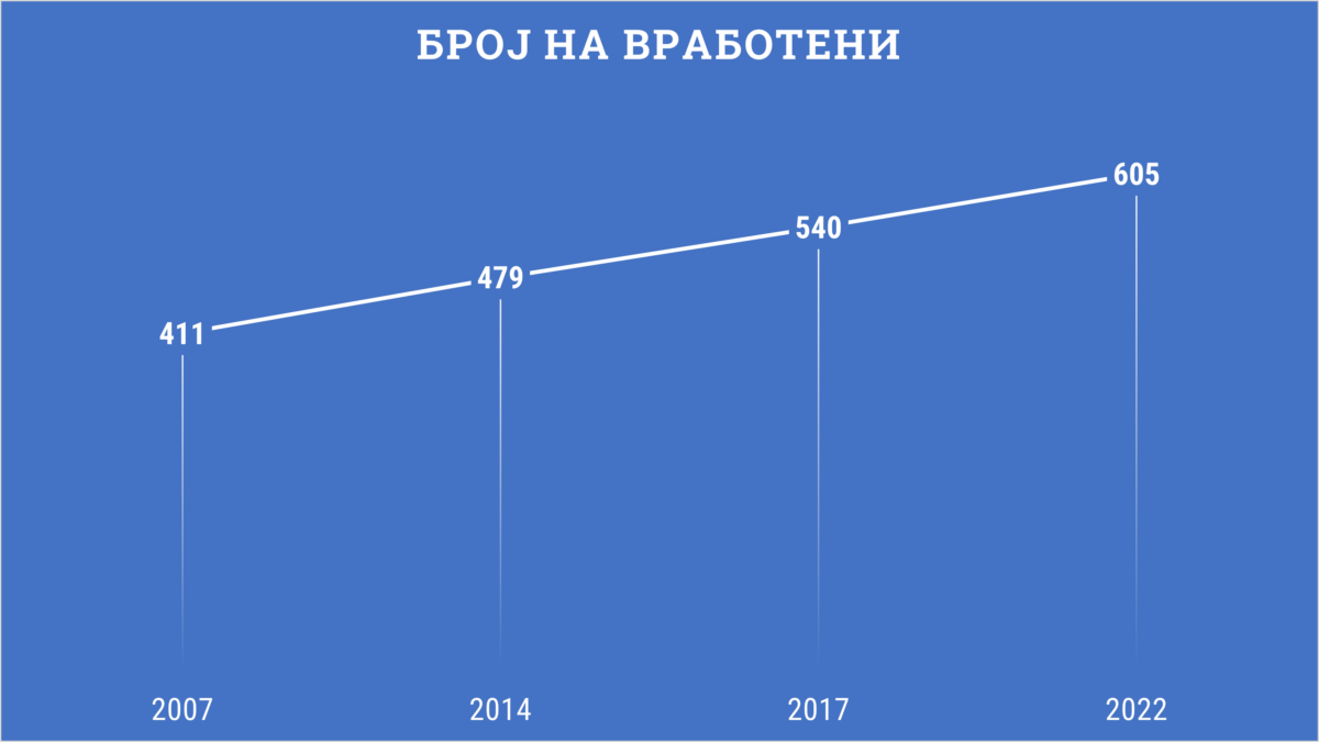 Во 2007 година МЕПСО имал 411 вработени, во 2014 имал 479, потоа во 2017 година стигнал до 540 вработени, а сега се 605, што за 15 години е зголемување од 30 отсто.