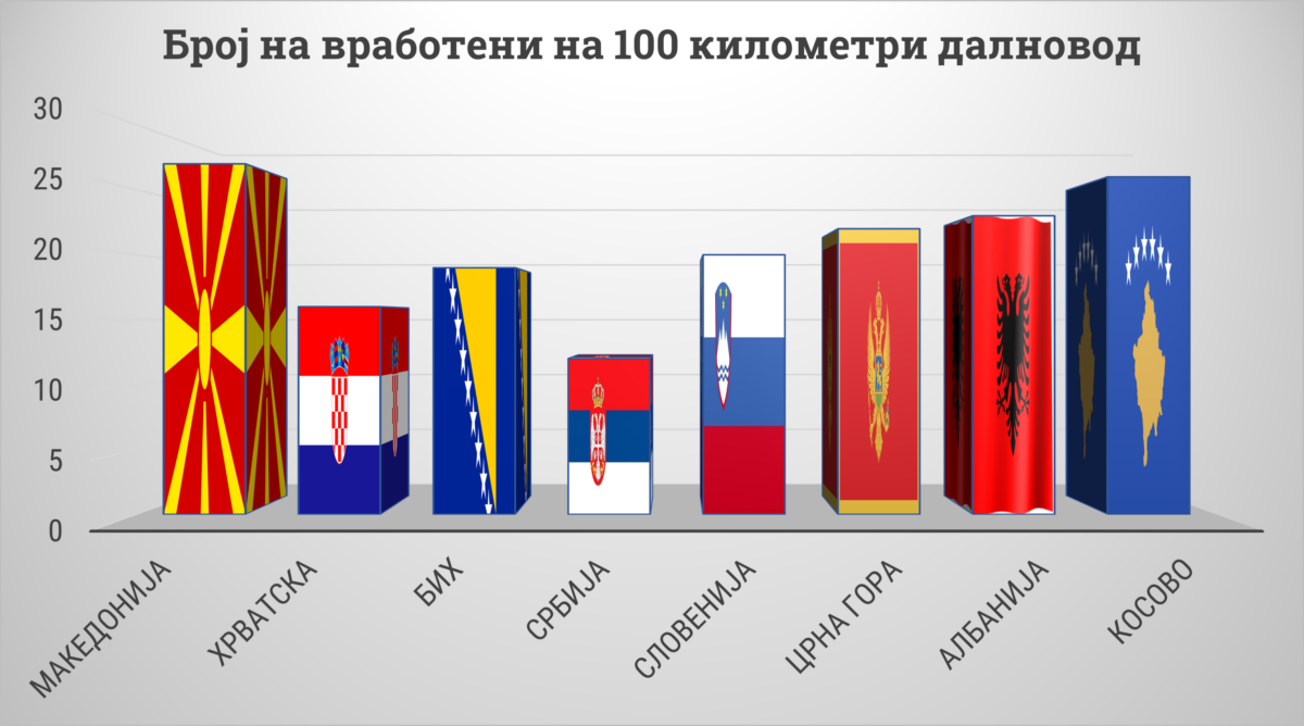 Македонскиот оператор има 27 вработени на 100 километри мрежа, во Хрватска 16, Босна и Херцеговина 19, а Србија 2,5 пати помалку од Македонија, односно 12.