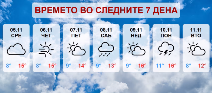 Под влијание на серија влажни воздушни бранови од утре во вечерните часови до понеделник (10.11.) следува период на променливо облачно време со повремени локални врнежи од дожд.