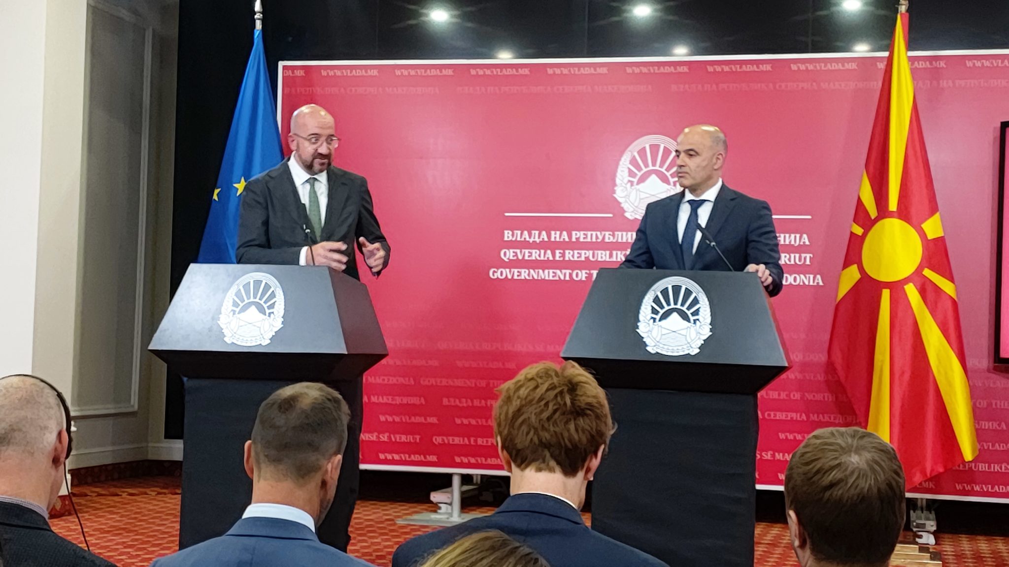 Според мене Северна Македонија припаѓа во ЕУ, вашата иднина е со нас и заедно сме на почетокот на пробив, на започнувањето на преговорите. Одлуката за ова е кај Вас, тоа е ваш суверен избор, порача претседателот на Советот на Европа, Шарл Мишел, на заедничка прес-конференција денеска во Скопје со премиерот Димитар Ковачевски.