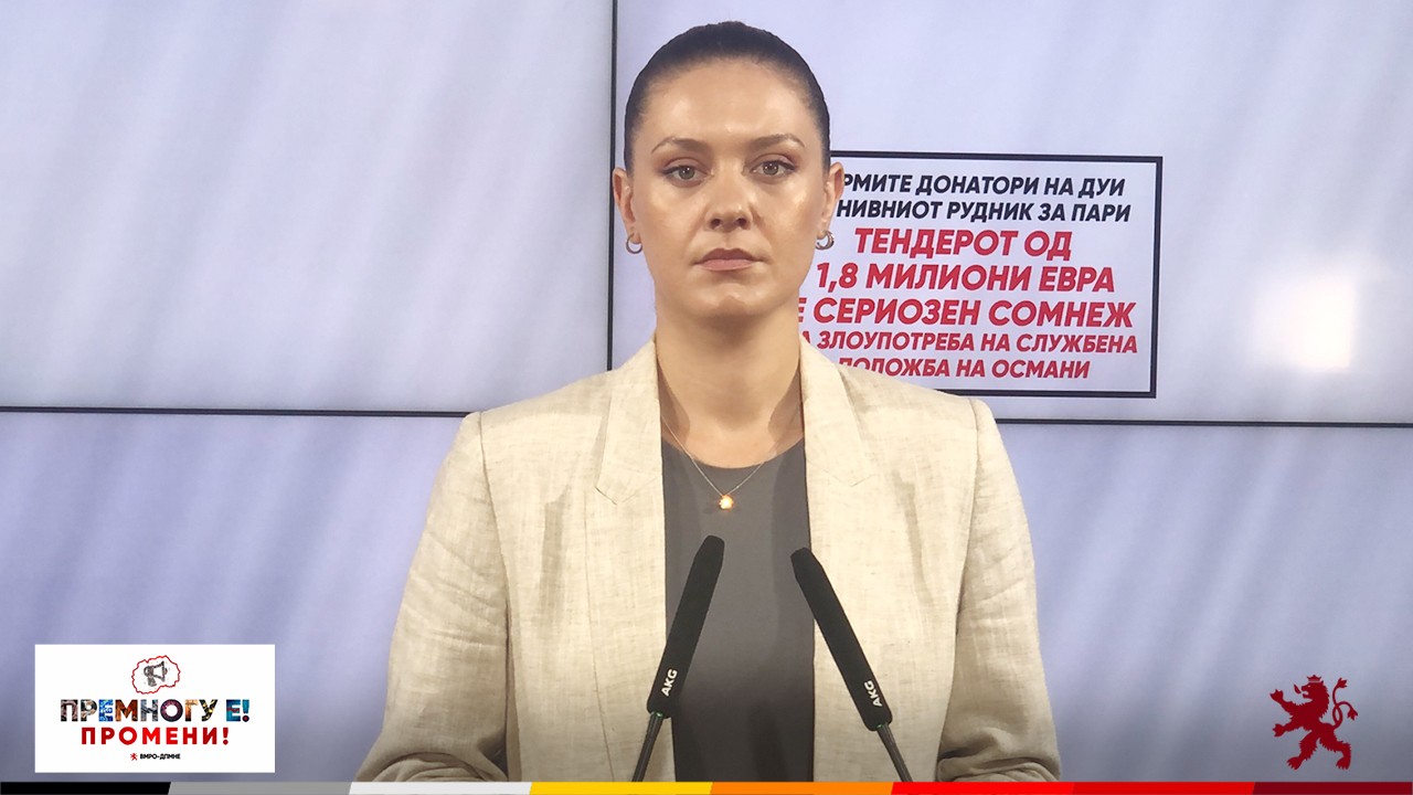 „Фирмите донатори на ДУИ се нивниот рудник за пари. Практично, секој министер во ДУИ си има своја фирма. И секој министер преку таа фирма си склучува тендери во четири очи. Најверојатно, внуците на функционерите на ДУИ сите се со силен претприемачки дух“, обвинија од ВМРО-ДПМНЕ.