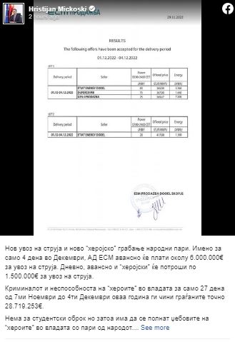 Нов увоз на струја и ново “херојско” грабање народни пари. Имено за само 4 дена во Декември, АД ЕСМ авансно ќе плати околу 6.000.000€ за увоз на струја. Дневно, авансно и “херојски” ќе потроши по 1.500.000€ за увоз на струја.