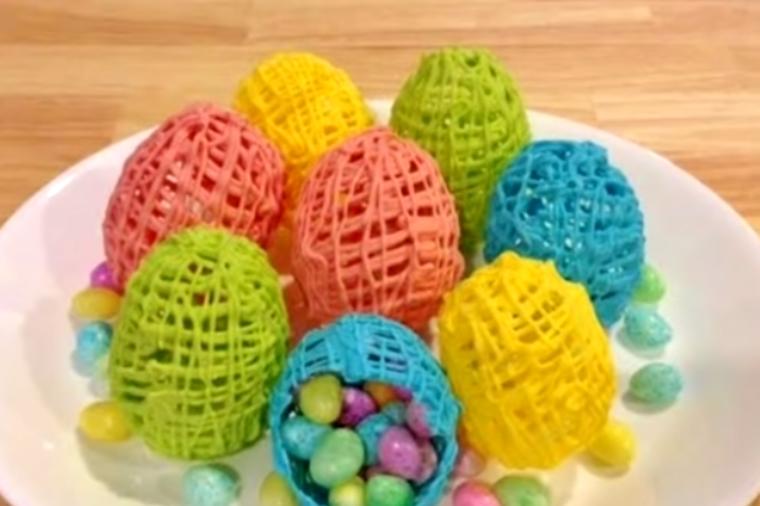 Ставете го во фрижидер околу еден час да се стегне добро и потоа дупнете го балонот. Извадете го од чоколадната лента и готово, ја добивте најинтересната велигденска декорација за јадење.