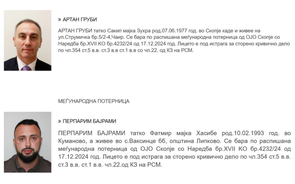 МВР на својата веб страница ја објави меѓународни потерници за Артан Груби и Перпарим Бајрами. АРТАН ГРУБИ татко Сакип мајка Зухра род.07.06.1977 год. во Скопје каде и живее на ул.Струмичка бр.5/2-4,Чаир. Се бара по распишана меѓународна потерница од ОЈО Скопје со Наредба бр.XVII KO бр.4232/24 од 17.12.2024 год. Лицето е под истрага за сторено кривично … Продолжи со читање МВР објави меѓународни потерници за Артан Груби и Перпарим Бајрами