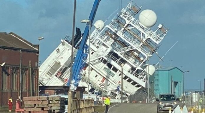 Снимки од британските медиуми покажуваат дека бродот „Петрел“ се навалил под агол од 45 степени.