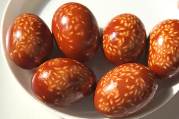 Подготовка: Потопете го јајцето во чиста вода, па валкајте го во сув ориз. Завиткајте во газа и затегнете за да го прицврстите оризот. Потоа ставете ги јајцата во водата со кромидот и варете. Ќе добиете прекрасни дезени.