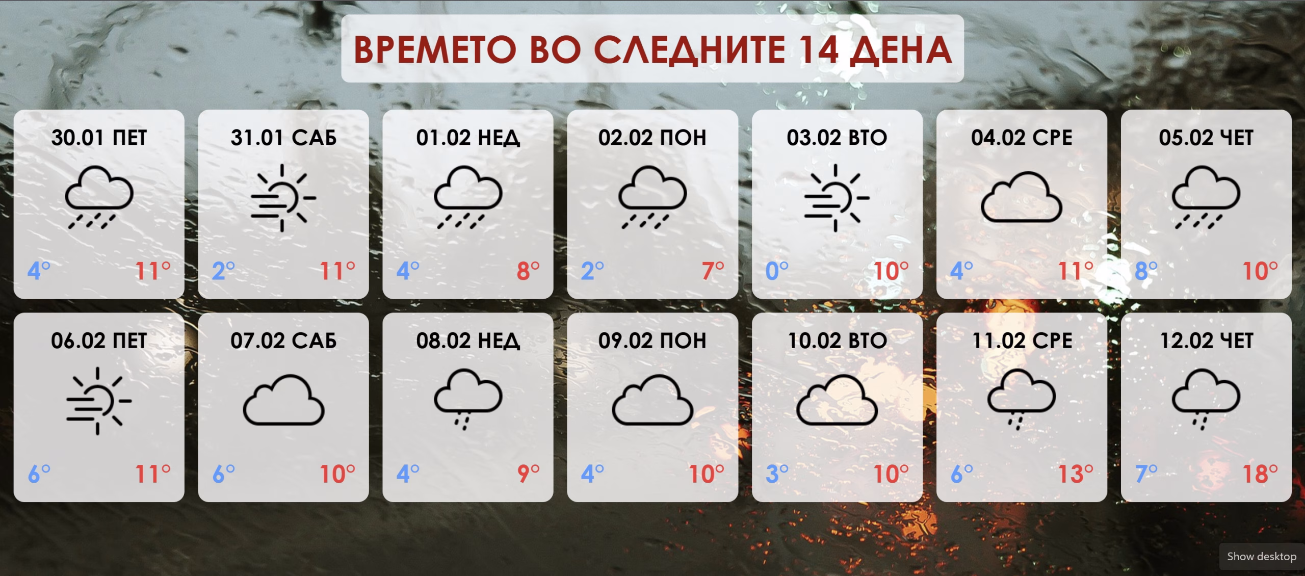Периодот започнува денес, петок (30.01), со облачно време и врнежи од дожд, при што температурите ќе се движат од минимални 4°C до максимални 11°C. Слично нестабилно време со дожд се очекува и во недела (01.02) и понеделник (02.02), кога максималните температури ќе бележат благ пад и ќе се движат помеѓу 7°C и 8°C.