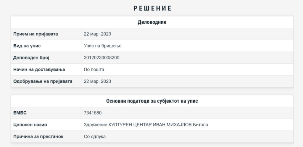 Бугарскиот културен клуб „Иван Михајлов“ денеска згаснува, објави Централниот регистар на Македонија.