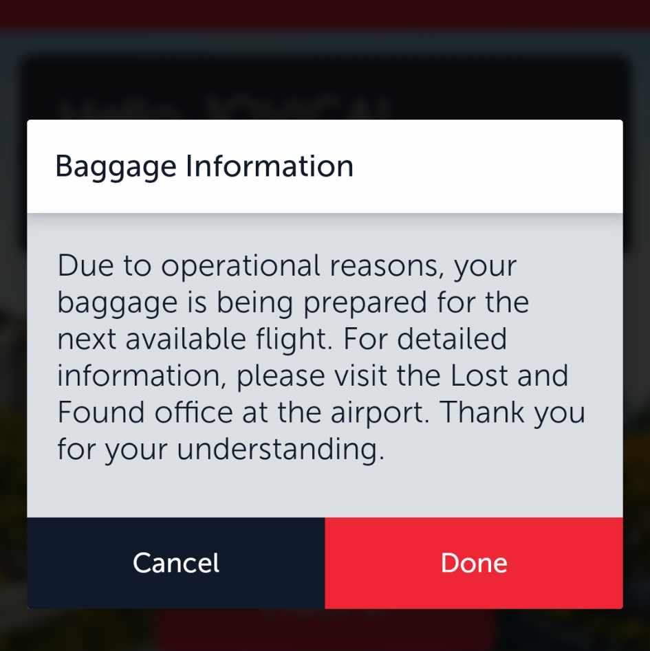Во повеќето случаи авион не смее да полета со багаж од патник кој не е на летот. Ова е правило кое се вика “baggage reconciliation” и е воведено од безбедносни причини (после терористички инциденти во минатото како бомбашкиот напад на Локерби во 1988).