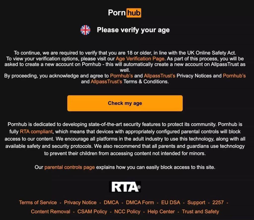 Pornhub, најголемата страница за возрасни во светот, сега прикажува известување до корисниците: „За да продолжиме, треба да потврдиме дека имате 18 години или повеќе, во согласност со Законот за безбедност на интернет на Велика Британија.“