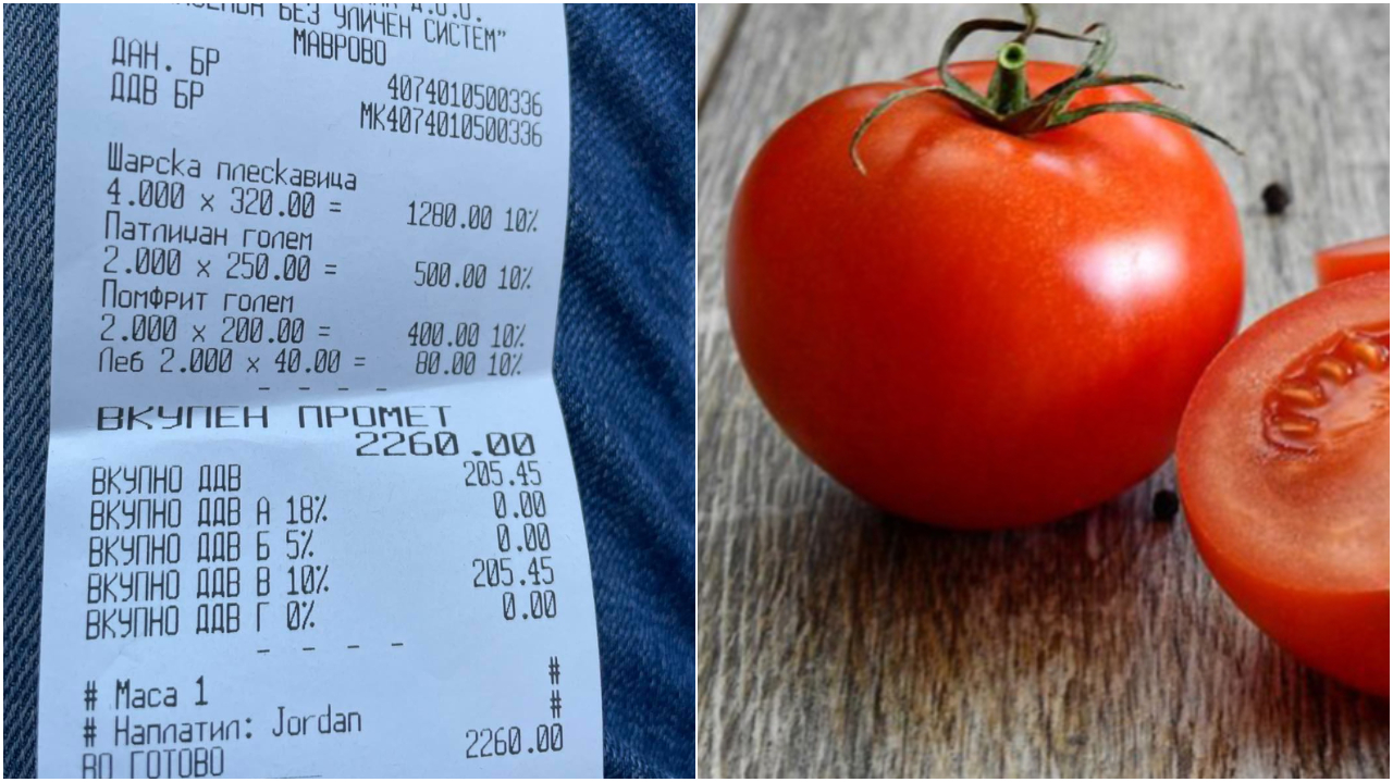 Македонски туристи кои седеле во ресторанот со поглед на цело Мавровско езеро, се пожалија дека се оштетени и испратија фискална сметка до редакцијата на „4NEWS.mk“ на која се гледа дека за два домати платиле 500 денари или по 250 за еден од нив. Туристите јаделе четири шарски плескавици за кои платиле по 320 денари и два големи помфрити за кои издвоиле по 200 денари за еден.