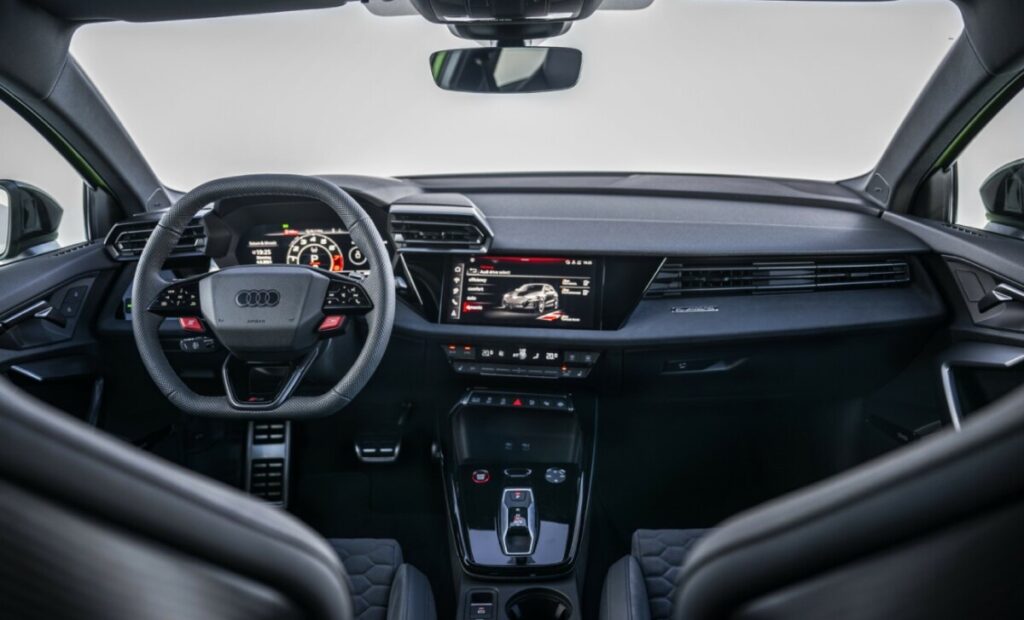 И во внатрешноста, во која доминираат темните тонови на бои, сè е насочено кон перформансите, со новиот волан, RS спортски седишта, карбонски карактеристики и спортски дисплеи. Рамен од горе и долу, воланот има значително поспортски изглед. Без разлика дали е обработен со перфорирана кожа како стандардна или опционална Dinamica боја, соодветно се вклопува на раката при свртување на RS 3 во остри свиоци. Во меѓувреме, опционалните RS седишта со корпа даваат уште подобра поддршка. Централната плоча на седиштата шиени во вид на саќе е изработена од микрофибер ткаенина Dinamica, која е комбинирана со Pearl Nappa кожа на страничните потпори. Под потпирачот за глава, црната заострена влошка се одликува со голема значка RS и со мат карбонскиот заден дел на потпирачот за грб на седиштето, се нагласува спортскиот изглед на RS 3.