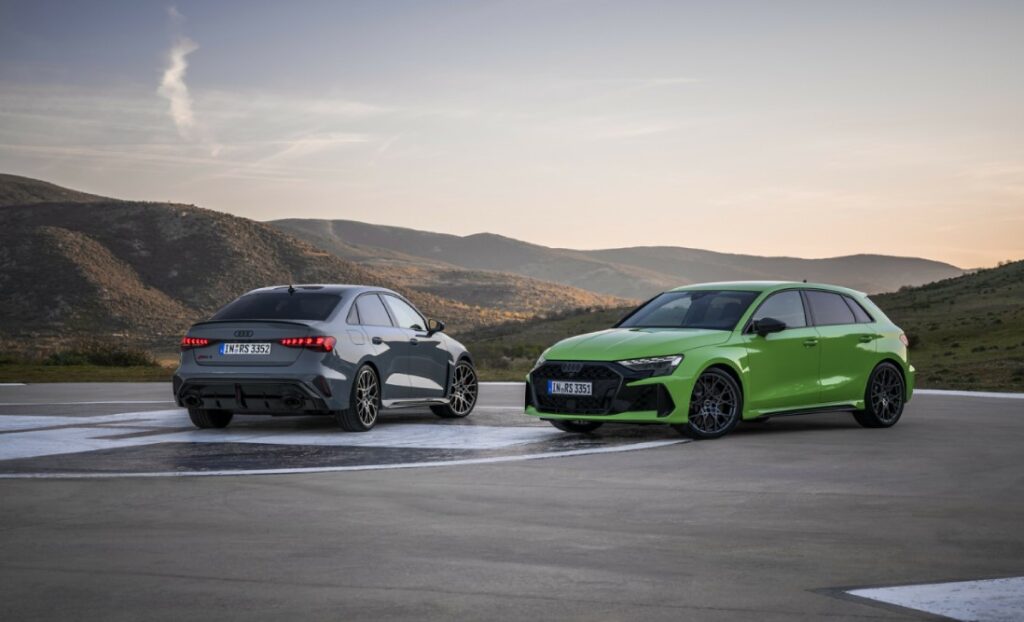 Audi RS 3 е придвижуван од легендарниот 2.5 TFSI мотор од Audi Sport со 294 kW (400 КС) и максимален вртежен момент од 500 њутн метри. Ова значи RS 3 (Комбинирана потрошувачка на гориво во l/100 km: 9,5–9,1 (24,8– 25,8 US mpg); комбинирани емисии на CO2 во g/km: 217–207 (349,2–333,1 g/mi); CO2-класа: G) забрзува од 0 до 100 km/h за 3,8 секунди и може да достигне максимална брзина од 290 km/h. Бројните успеси во мотоспортот го прават наградуваниот мотор со пет цилиндри еден од најактивните кај Audi и го прават возењето на RS 3 неспоредливо искуство. Особено ова се должи на неговиот уникатен звук, кој се заснова на потписната секвенца на пукање 1-2-4-5-3. Соседните и несоседните цилиндри палат наизменично обезбедувајќи силен ритам и карактер, соодветно оркестрирани од двојниот издувен систем RS со променлива контрола на вратичката. Притиснете го копчето за стартување/стоп на моторот со црвени прстени и ќе се огласи звукот на петцилиндричниот мотор – пообемно и уште попрепознатлив во динамичните режими на избор на погон на Audi, RS Performance и RS Torque Rear. Покрај тоа, контролата на вратичката на издувните гасови беше оптимизирана во опсегот на вртежи во минута помеѓу 2.200 и 3.500 вртежи. На овој начин, петцилиндарецот генерира постојан и пополн звук без разлика кој режим е избран. Audi Sport на тој начин го подобрува емотивното искуство во возењето во врвниот модел на семејството A3 – особено во комбинација со опционалниот издувен систем RS Sport.