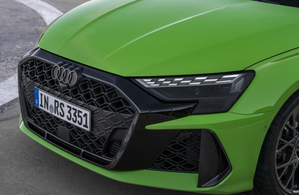 По надградбата, Audi RS 3 има значително поспортски изглед. Доминантна карактеристика на наметливиот преден дизајн е хексагоналната Singleframe со впечатлива граница. Порамна и значително поширока од порано, ја нагласува динамиката на компактниот спортски автомобил со неговата волуменозна ромбоидна решетка. Истото важи и за двата функционални странични доводи за воздух – нагласени со вертикални црни сечила – и трите отвори над предниот сплитер, кој сега ја опфаќа целата ширина на возилото и дозволува RS 3 да биде уште понизок – потсетувајќи на Audi Sport quattro S1 Pikes Peak од 1987 година. Со редизајнирани дневни светла, предните светла исто така ги истакнуваат перформансите на автомобилот. Дигиталниот потпис, кој прикажува карирано знаме во RS 3 се состои од 24 елементи. Понатаму, во комбинација со матричните LED светла, возачите за прв пат можат да изберат помеѓу три дополнителни дизајни на дневни светла во екранот на допир MMI.